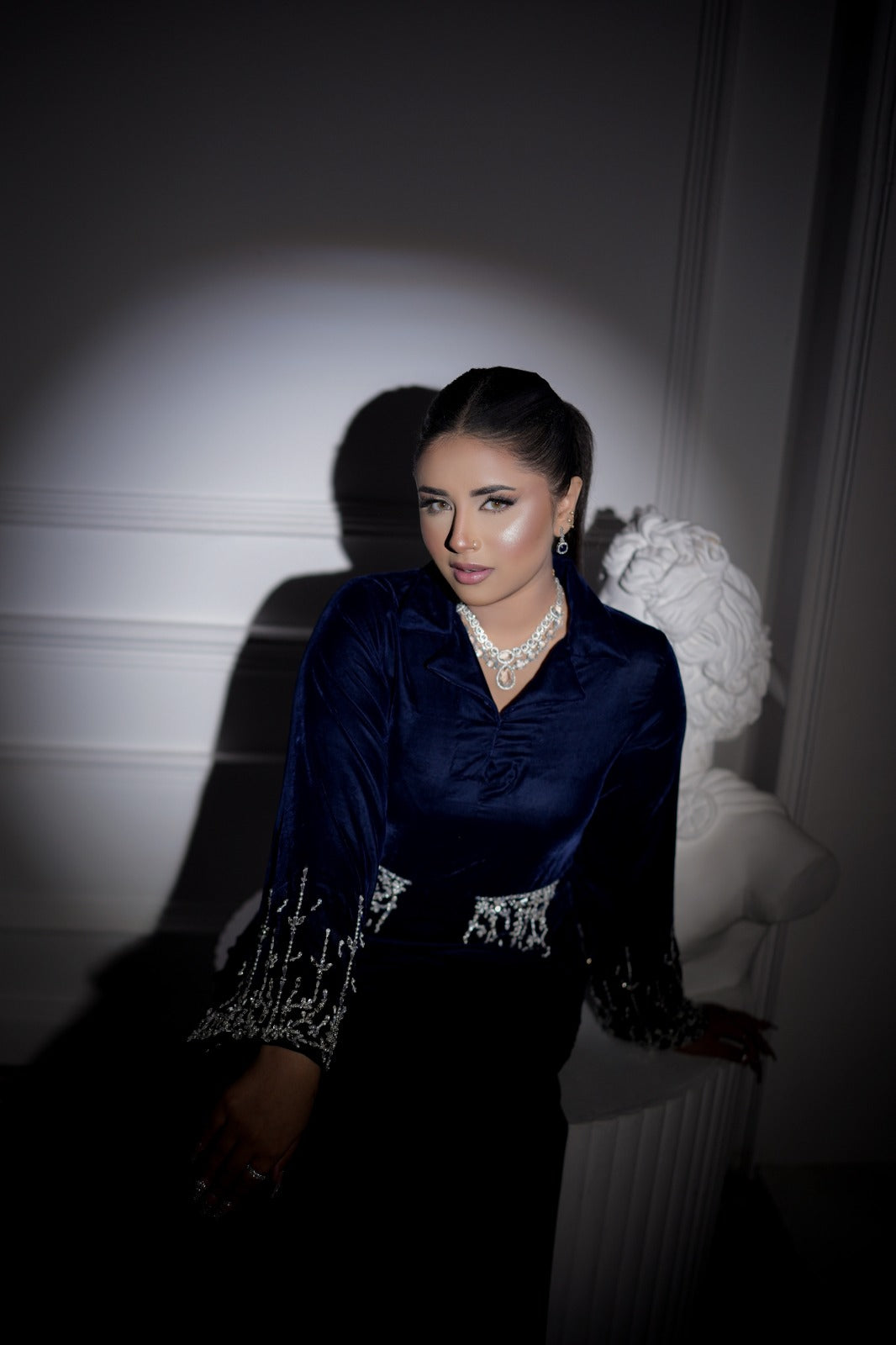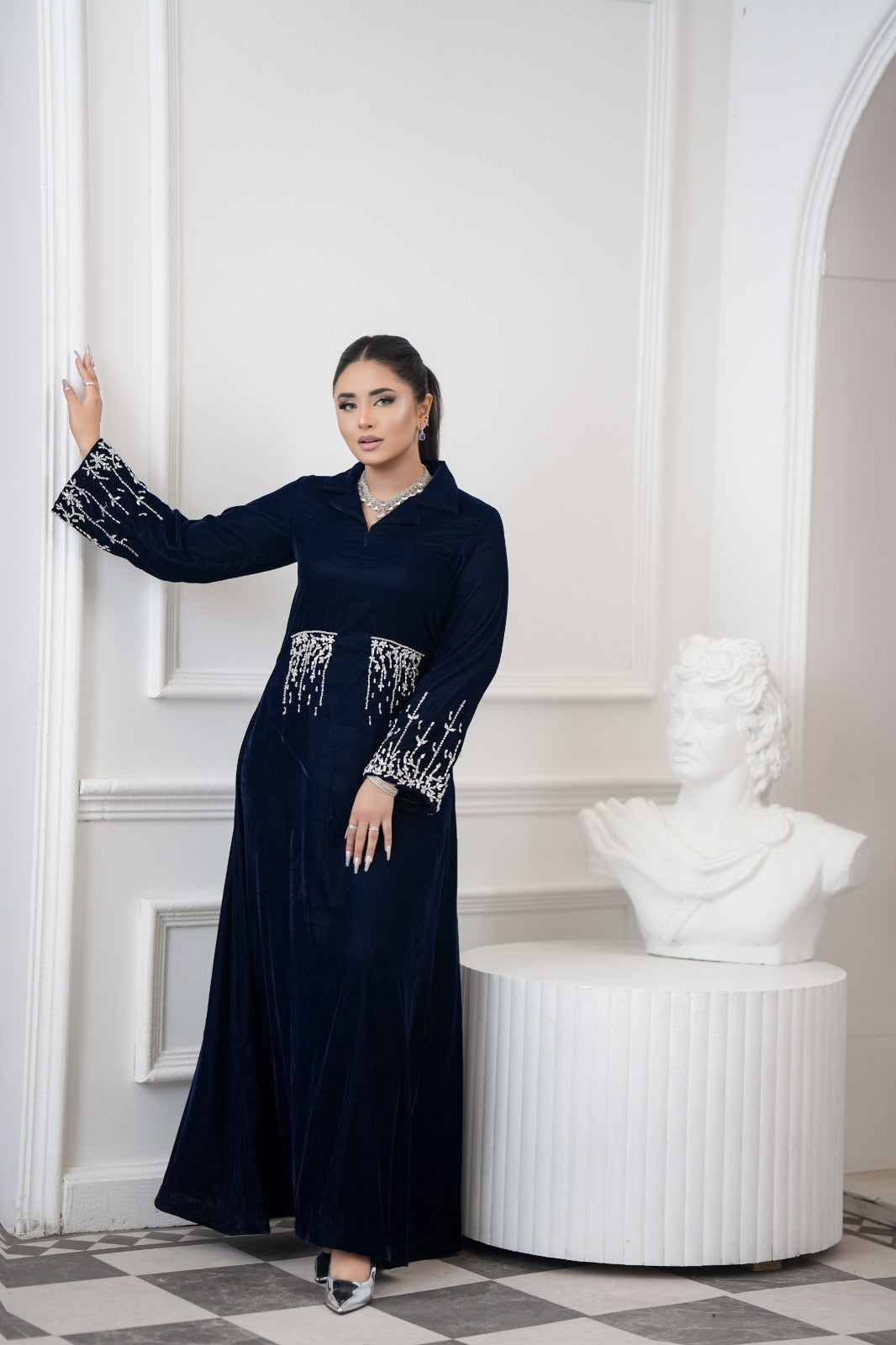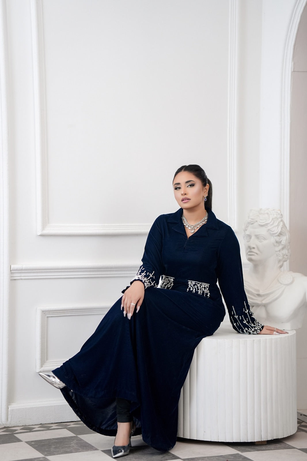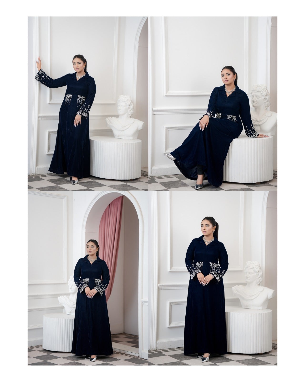 Step into luxury with our Midnight Royalty Blue Velvet Dress, crafted from ultra-soft premium velvet. Designed for festive evenings and winter occasions, this elegant outfit offers a rich texture, flawless fall, and a timeless silhouette that enhances confidence and grace. Perfect for weddings, dinners, and formal gatherings.